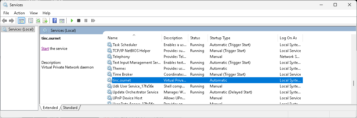 tinc.ournet service installed tinc.ournet service startedyou have installed tinc as the service in your system and able to manage it there. A bit later will be described how to manage.