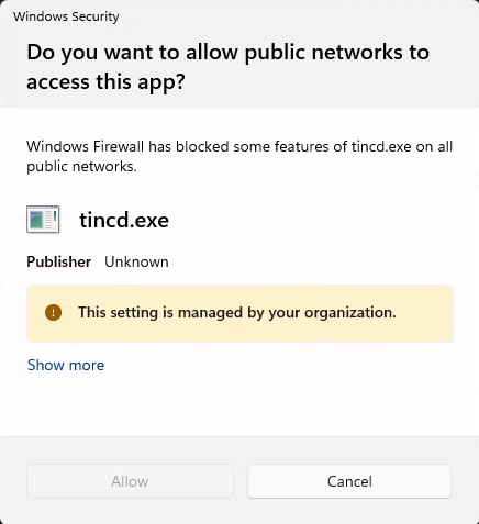 If appearing the window "Do you want to allow public network to access this app?", click "Allow". If not possible (button "Allow) is disabled, do the following in the command line as Administrator: